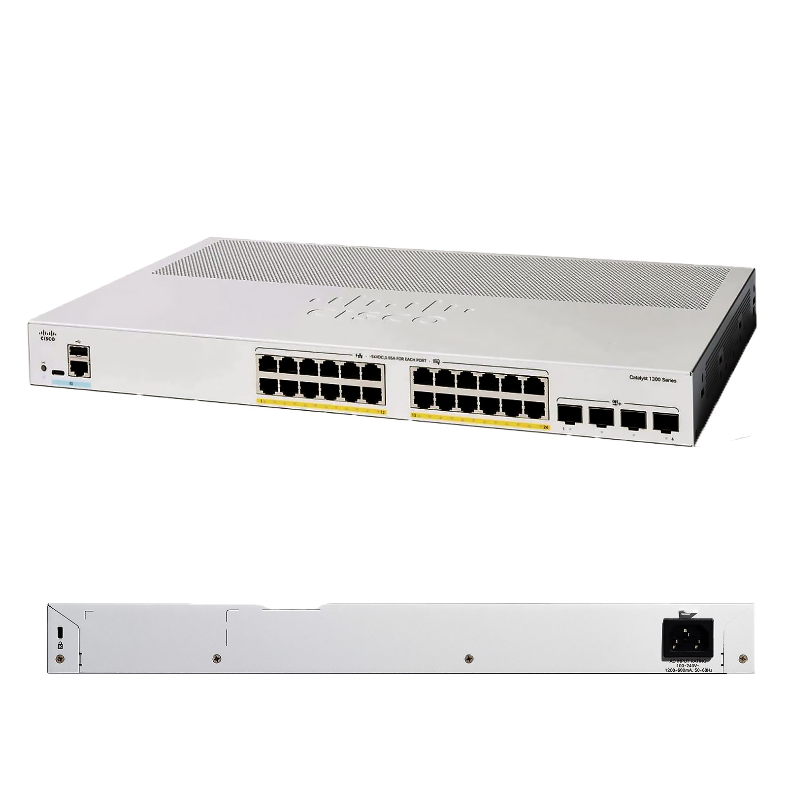 24 порта 10/100/1000 с PoE+ (до 30W на порт) и 4 аплинка 10G SFP+. Part Number: C1300-24P-4X.