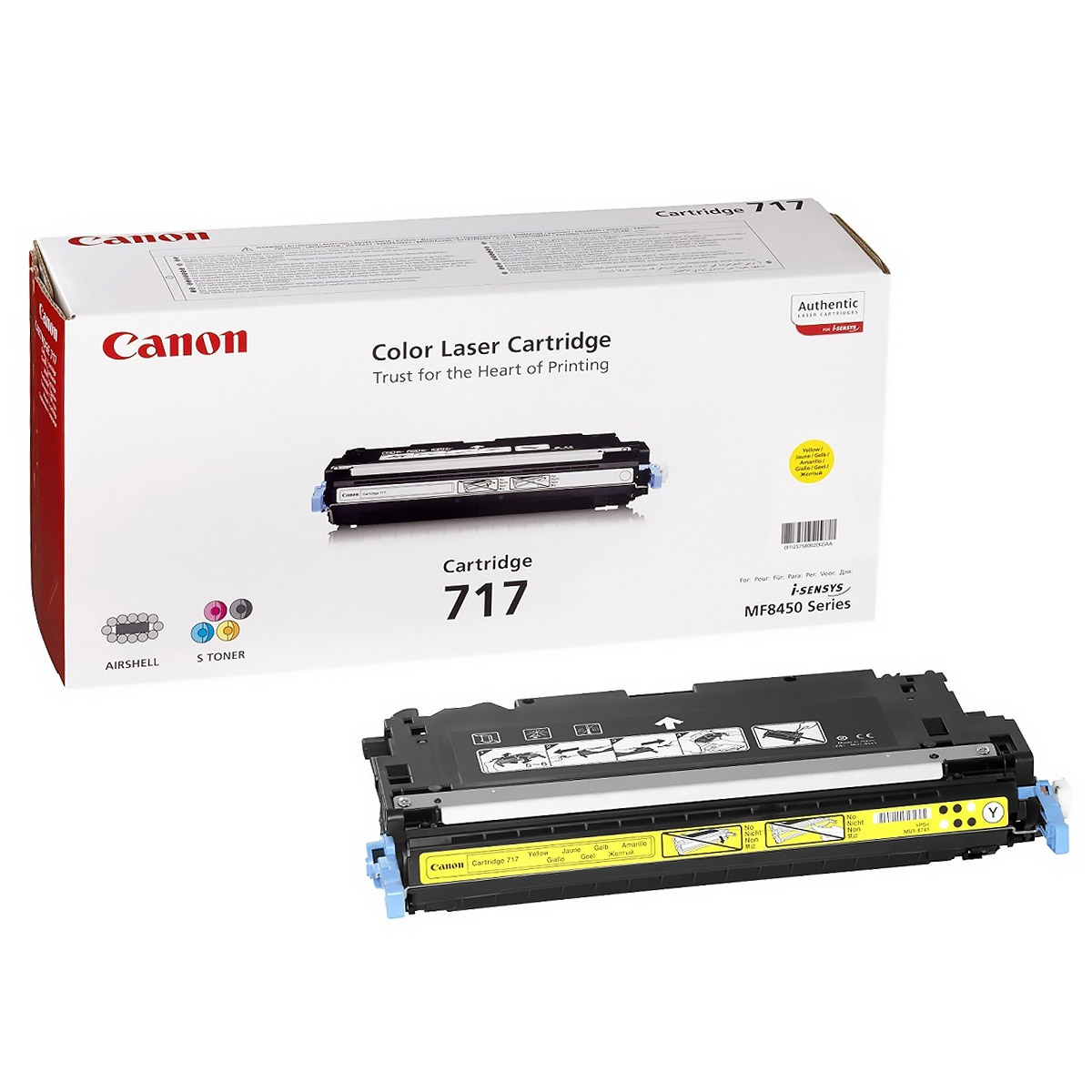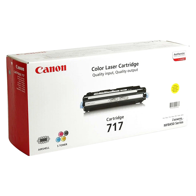 Картридж Canon 717 Y содержит тонер жёлтый цвета. Для полноценной цветной печати требуется установка всех цветных картриджей (черный, голубой, пурпурный, желтый). Данный картридж отвечает за воспроизведение жёлтый компонента цветного изображения.