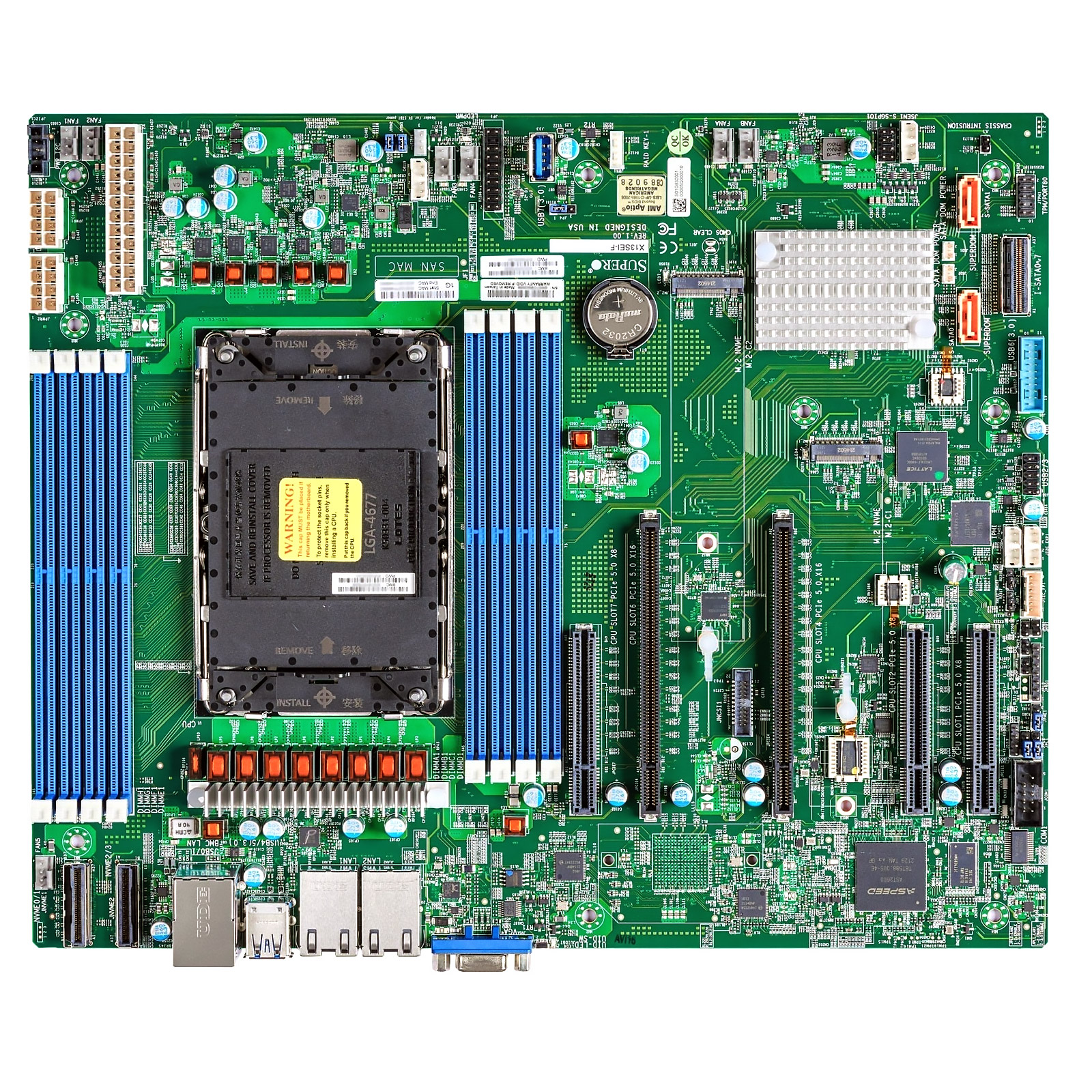 Сокет LGA4677, чипсет Intel C741, форм-фактор E-ATX. Поддержка 8 модулей DDR5 памяти (макс. 2048 ГБ), 8 портов SATA.