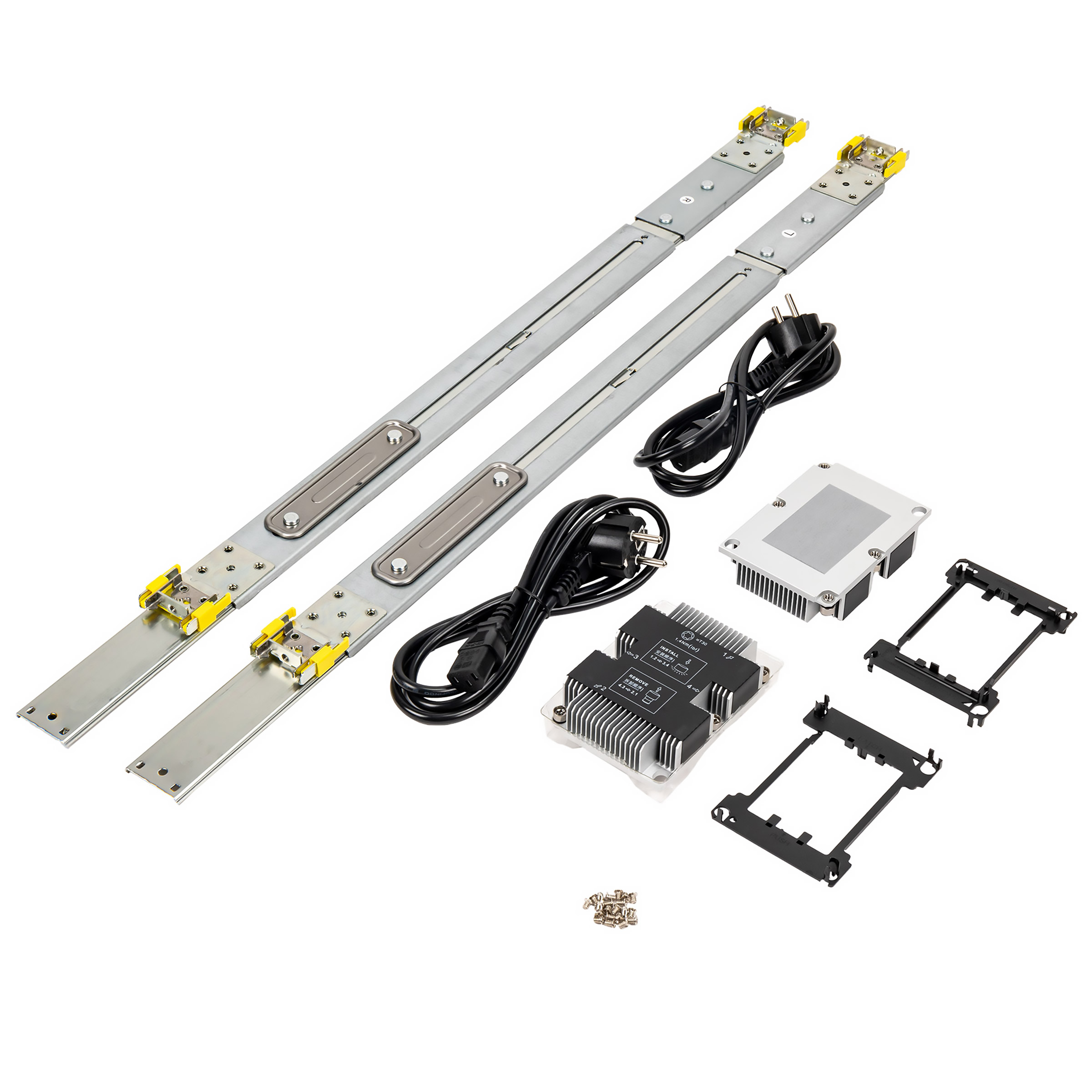 Сервер, блоки питания, процессорные радиаторы, рельсы, кабели питания |