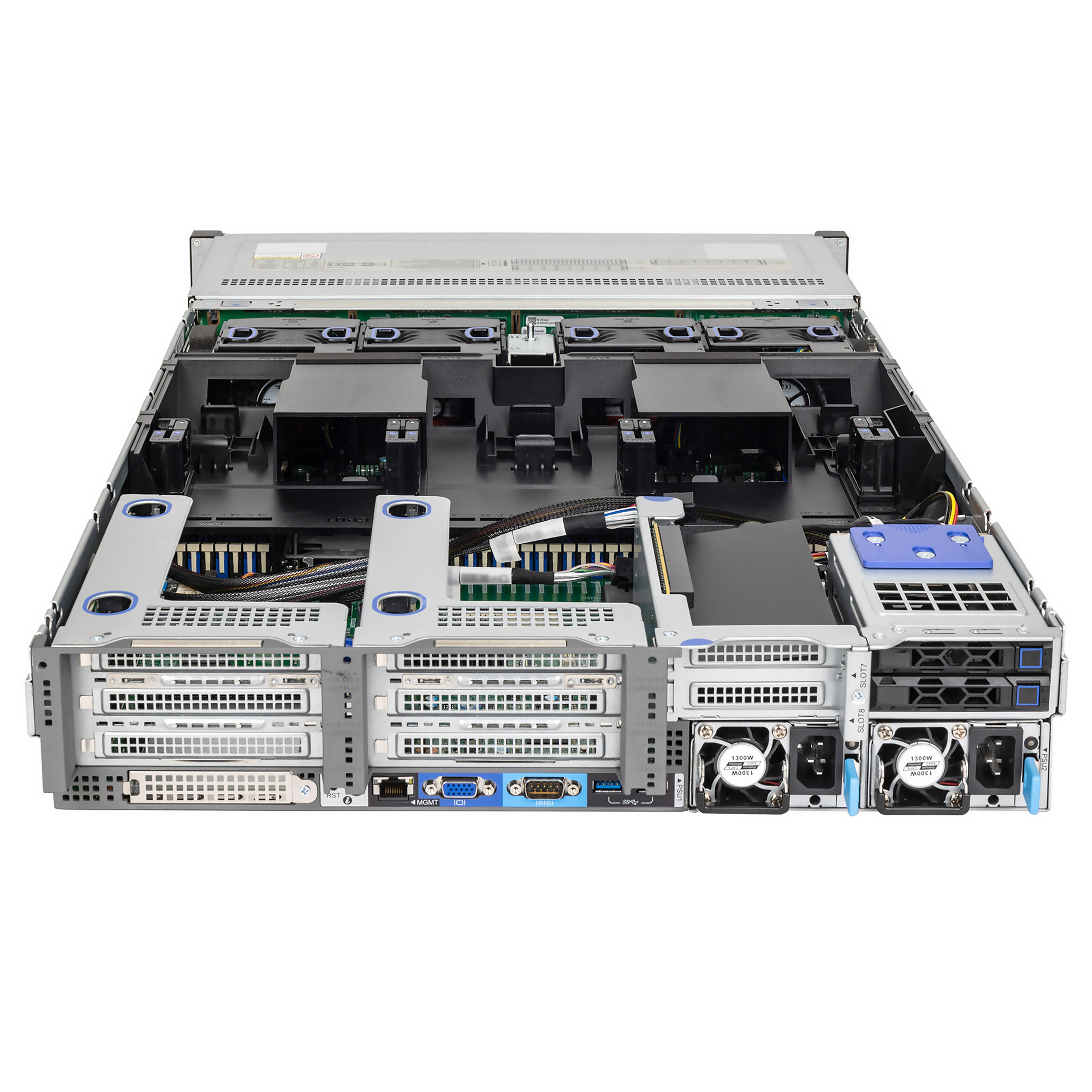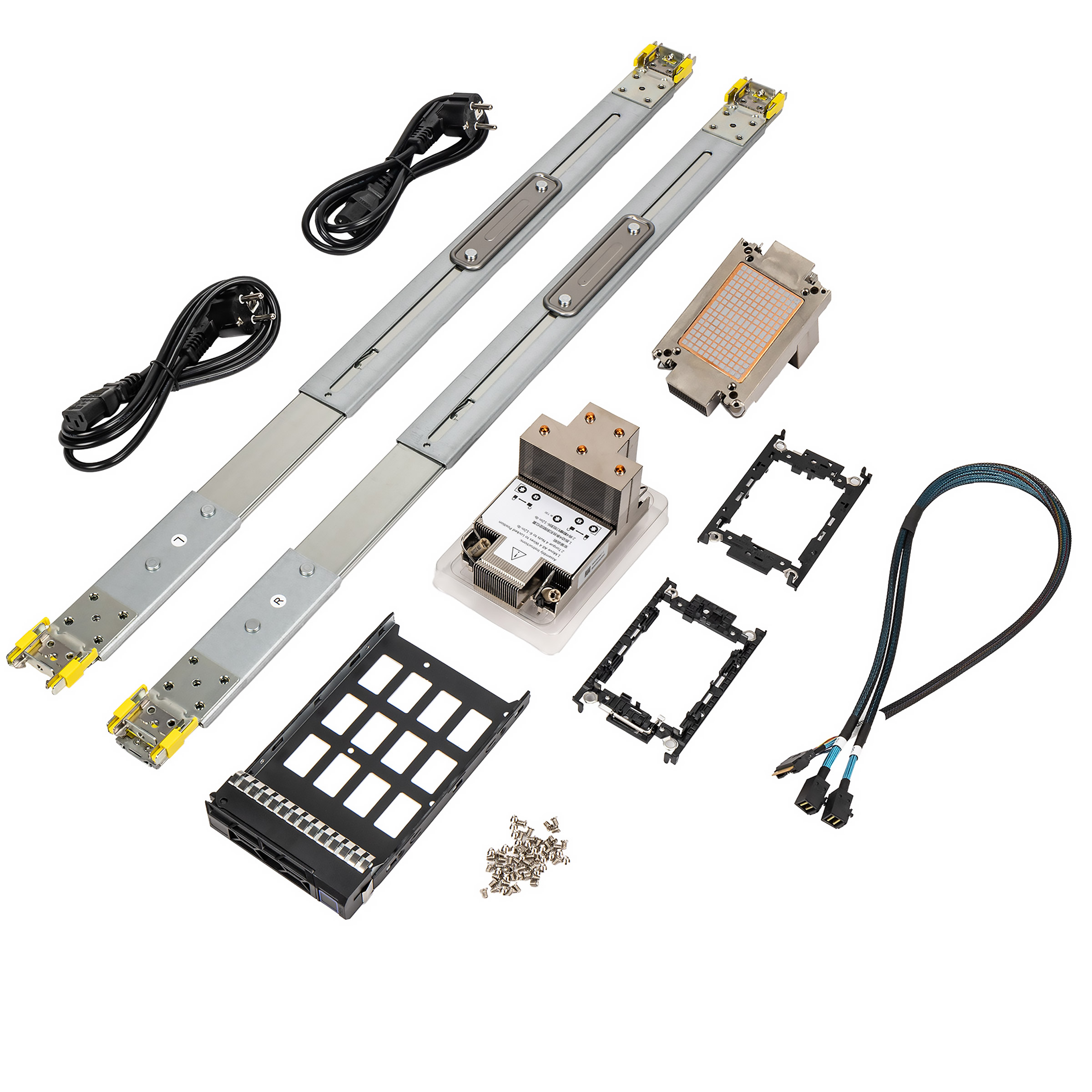 Сервер, блоки питания, процессорные радиаторы, рельсы, кабели питания |