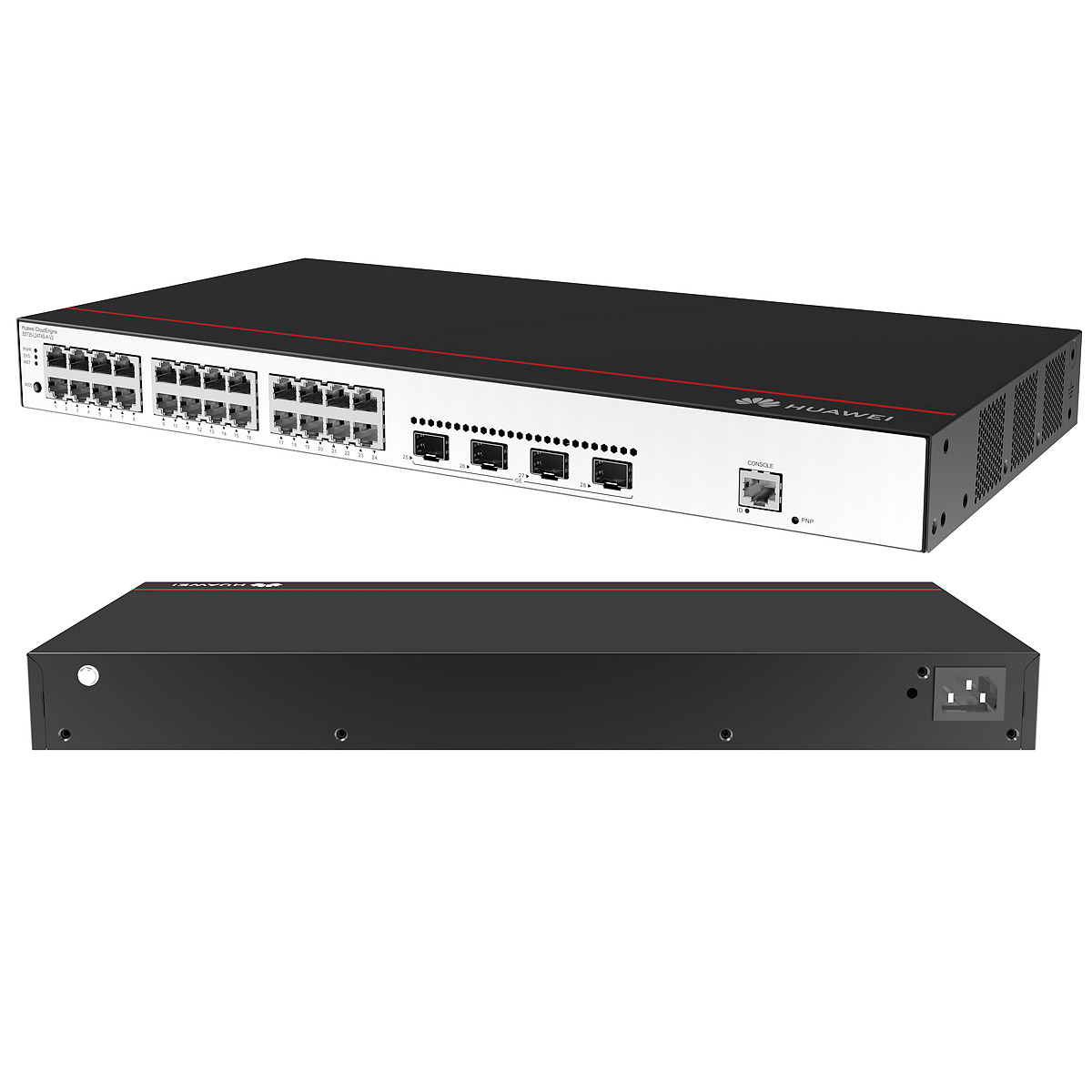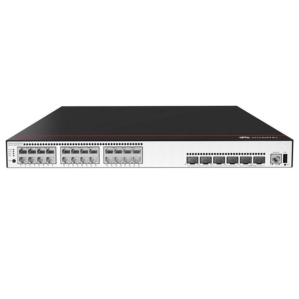 Коммутатор Huawei S5735-L24P4XE-A-V2 98012026_BSW имеет на борту 24 порта 10/100/1000BASE-T с поддержкой PoE+, 4 порта 10G SFP+, 2 стековых порта 12G, стандартный блок питания, в комплекте есть кабель 1,5 м 02311VGN